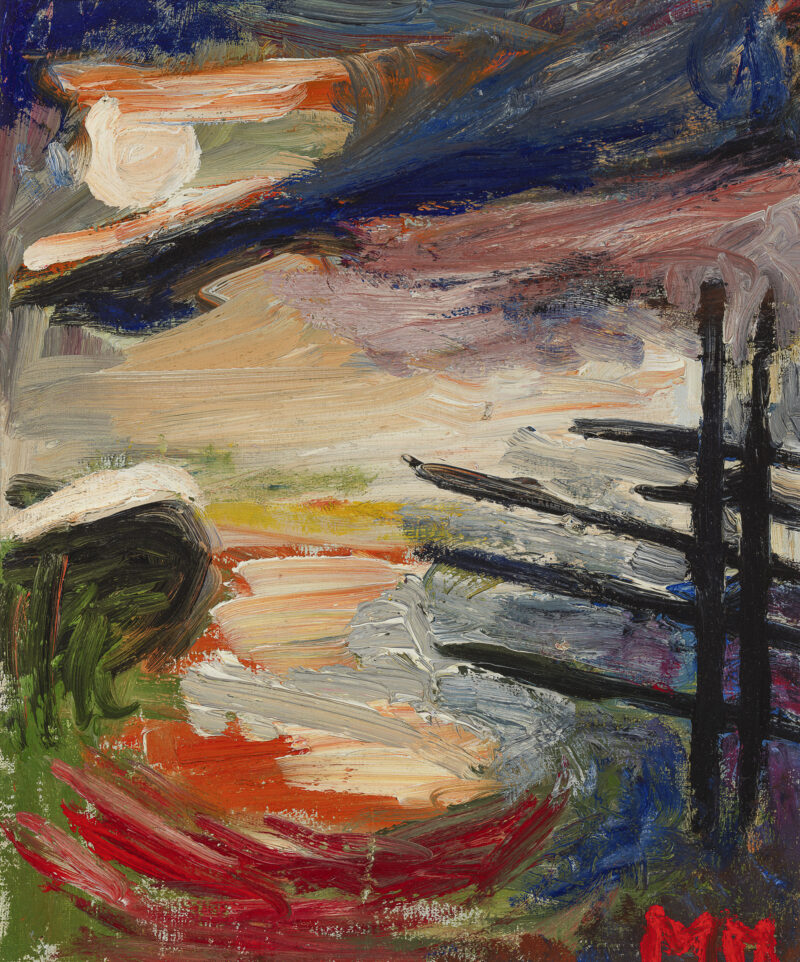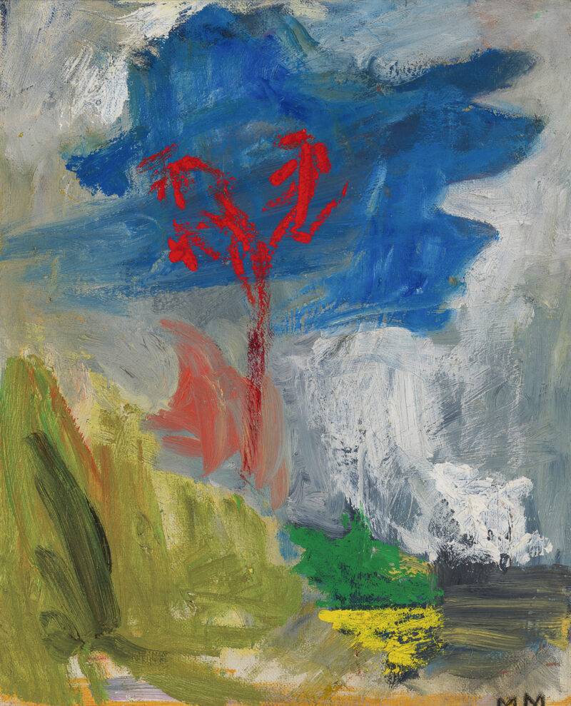 In both palette and handling of light, Lit Tree is more serene than Markkula’s fiery sunsets. Still, the bright red tree trunk stands in sharp contrast to the paler shades of the background and the muted foreground. A vivid blue sky adds further tension, serving as a counterpoint to the red, while the vigorous brushwork animates the scene throughout.