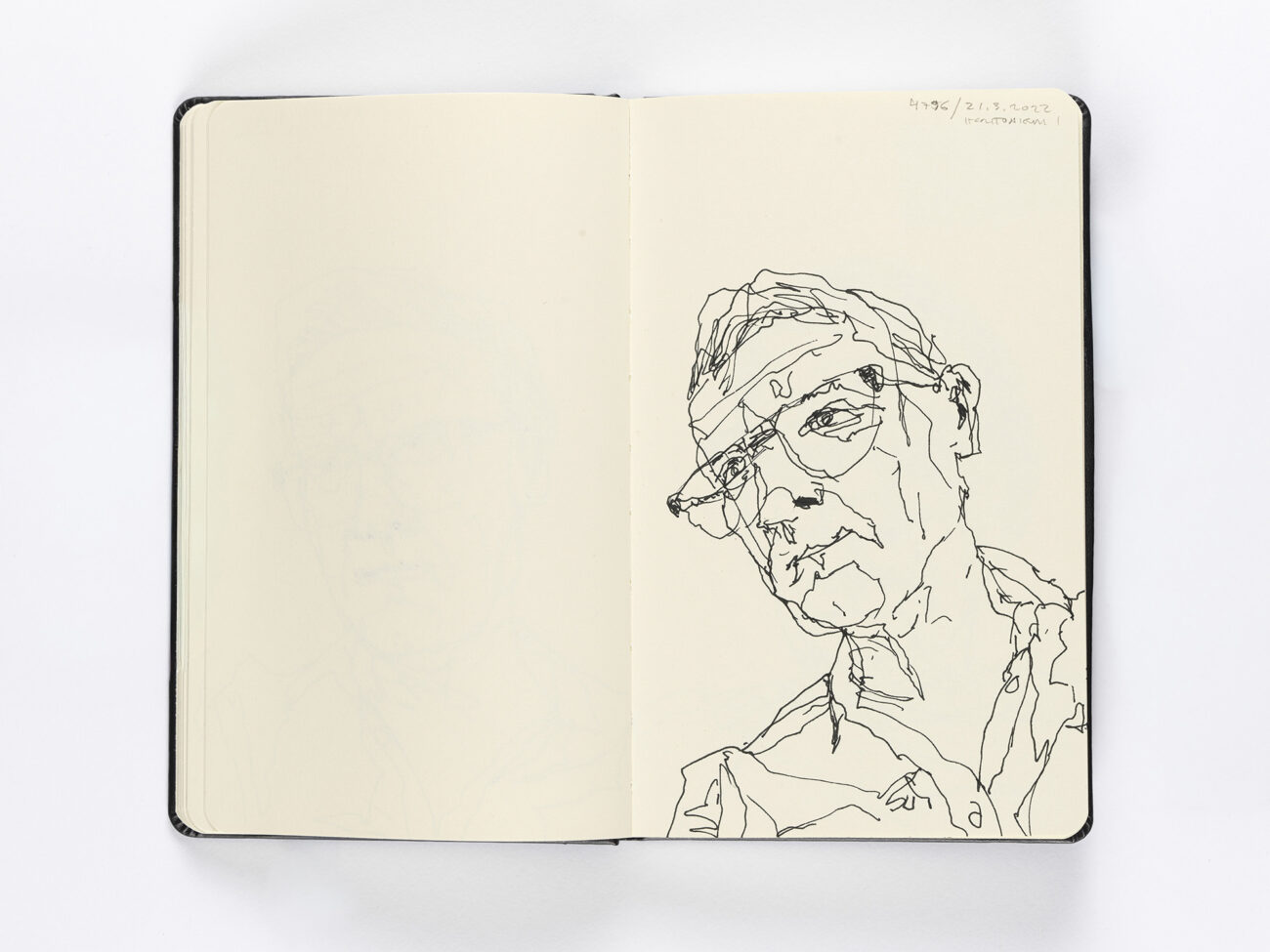 From the very first self-portrait, he has marked each image with the date and a serial number. Later, he began adding notes about where the portrait was made or about significant events of the day. Despite personal tragedies and calamitous global events, everyday life has gone on – and the sketchbooks have continued to fill, one at a time.