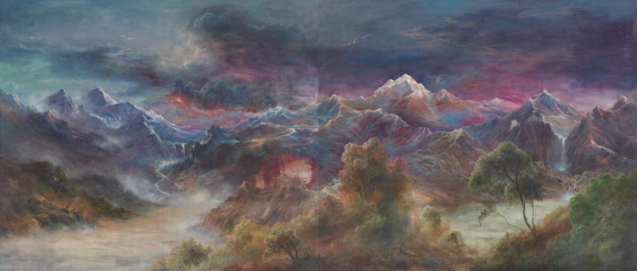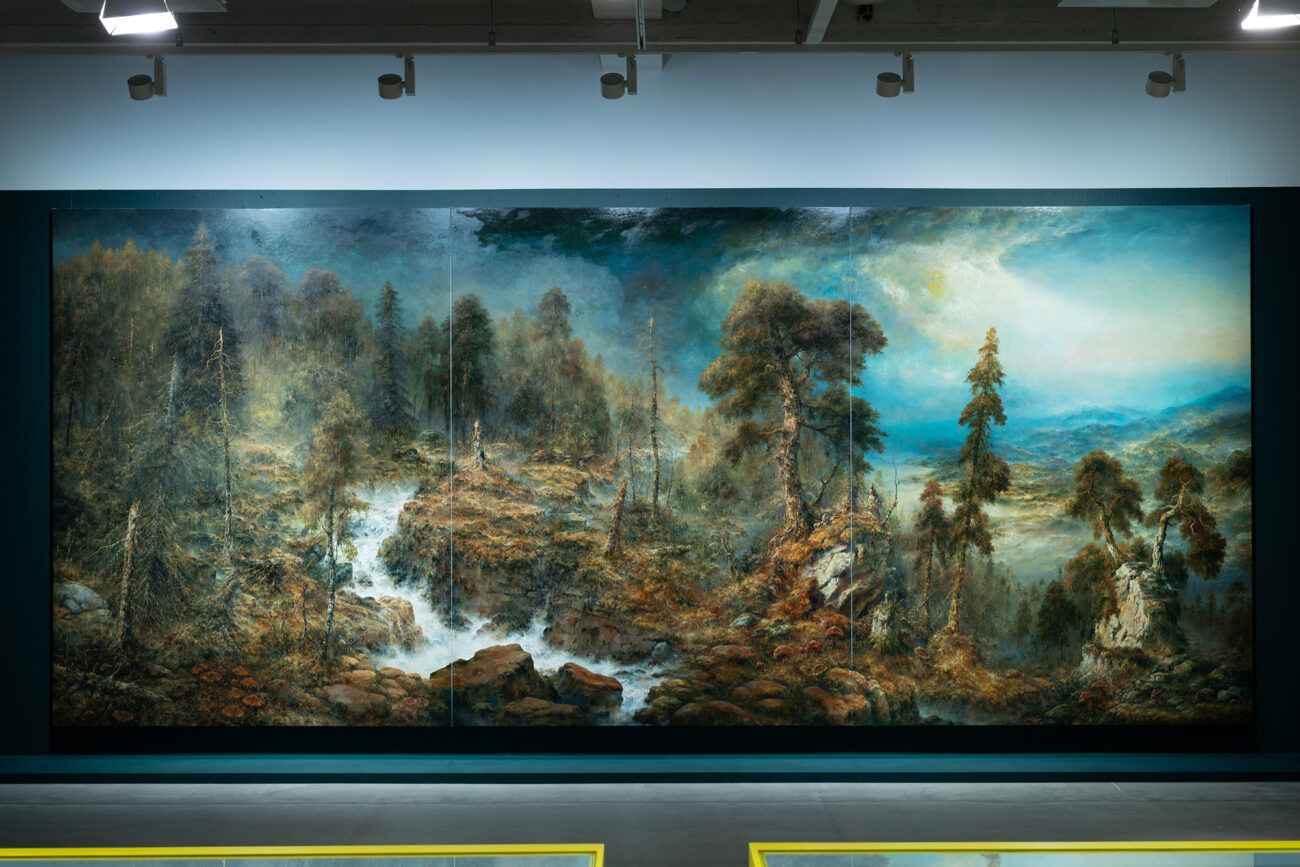 Ala-Maunus is known for monumental landscapes that almost overwhelm the viewer with their intensity. Measuring four metres wide, Übernatur merges snow-capped mountains, lush forests, and the menacing atmosphere of an imminent volcanic eruption. While his early landscapes included human figures, later works are strikingly devoid of people. As we observe these scenes, we are left to wonder: do these landscapes belong to a time before humans, or do they depict a post-human world?