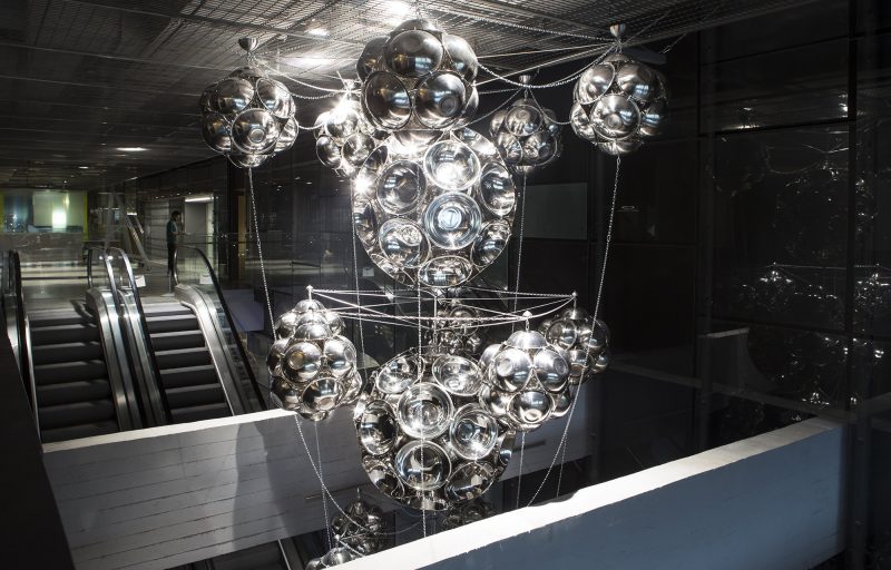 Kari Cavén’s UHO (Unidentified Hanging Object) will welcome visitors at the escalator at the Eteläinen Rautatiekatu entrance. The hanging sculpture, made from steel bowls, is a part of the art collection owned by the people of Helsinki.