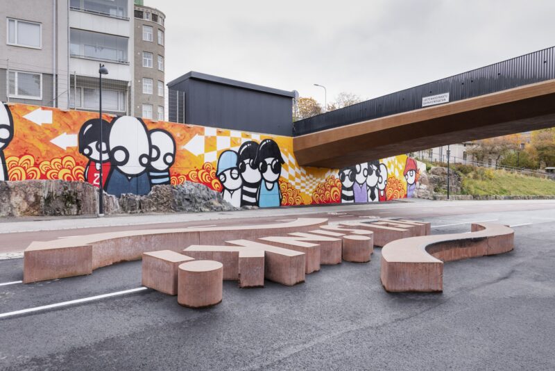 The piece Love Helsinki, created by visual artist Janne Siltanen (b. 1976), is a two-part piece that brings to life the urban space and light transport routes of the city centre, comprising both a concrete sculpture spelling out the word ‘Helsinki’ and a mural on the retaining wall.