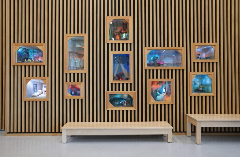 Jussi Valtakari and Antti Ylönen’s series ‘Once upon a time…’ fills the lobby walls at Daycare Aurinkokallio in Kannelmäki. The artwork features dioramas of different sizes, inspired by fairytales collected from around the world.