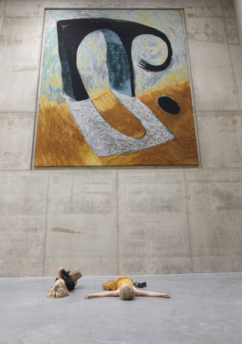 Arja Kärkkäinen’s two-part artwork Moon Bearer dominates the hall of the Oulunkylä Primary School’s extension. Next to the large wall tapestry is a painted inset resembling the moon. The title refers to the moon’s mysterious and romantic unattainability.