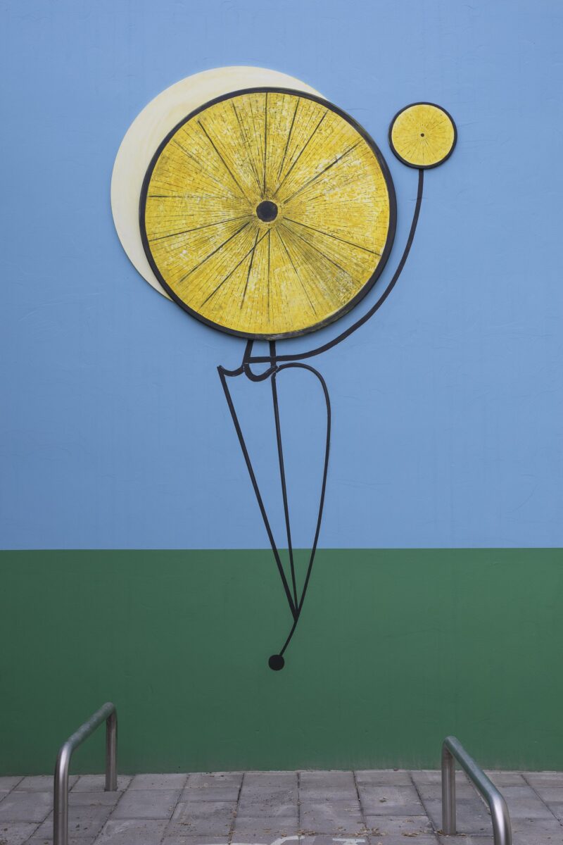 On the opposite wall, a piece resembling dandelion has sprouted on the wall. Upon closer inspection a historical high-wheel bicycle turned upside down. Its large wheel is positioned in front of the sun, and the figure riding the bike is keeping the sun – and thus time – moving. According to the artist, the work refers, among other things, to a sundial, which tells the time through the movements of shadows and light.