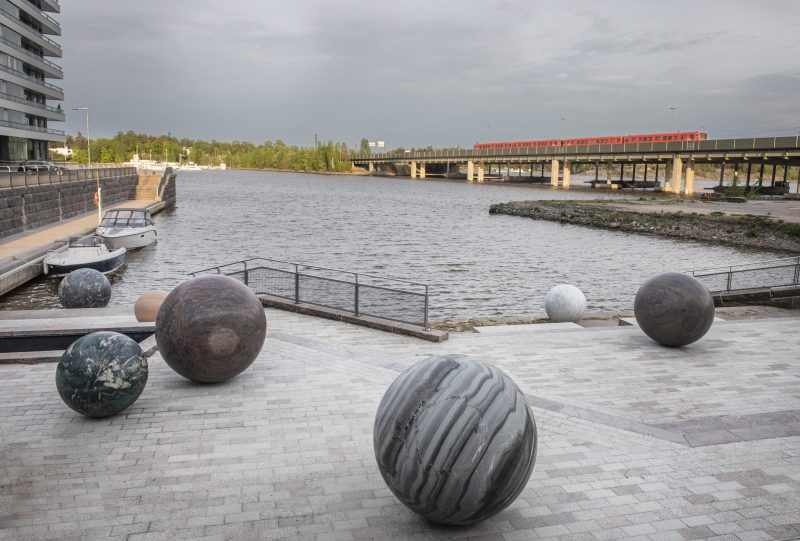 Pars Pro Toto consists of eight stone spheres reminiscent of planets. For the Helsinki edition of the work, the artist chose primarily Nordic types of rock. Visible on the stones is the ancient process that formed them, age and the passage of time. The Latin title of the work, Pars Pro Toto, ‘a part for the whole,’ expresses one of the dimensions of the work: from atoms to solar systems, the structures of the universe keep repeating. The existence of individuals is contrasted with the massive scales of time and matter.